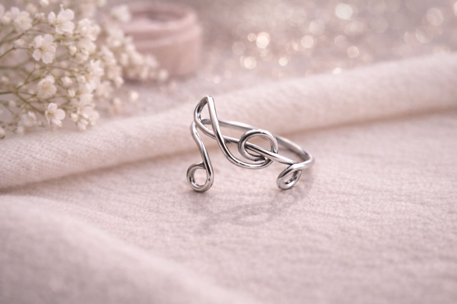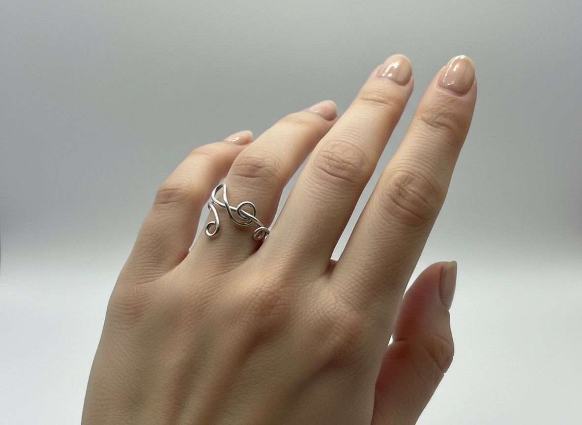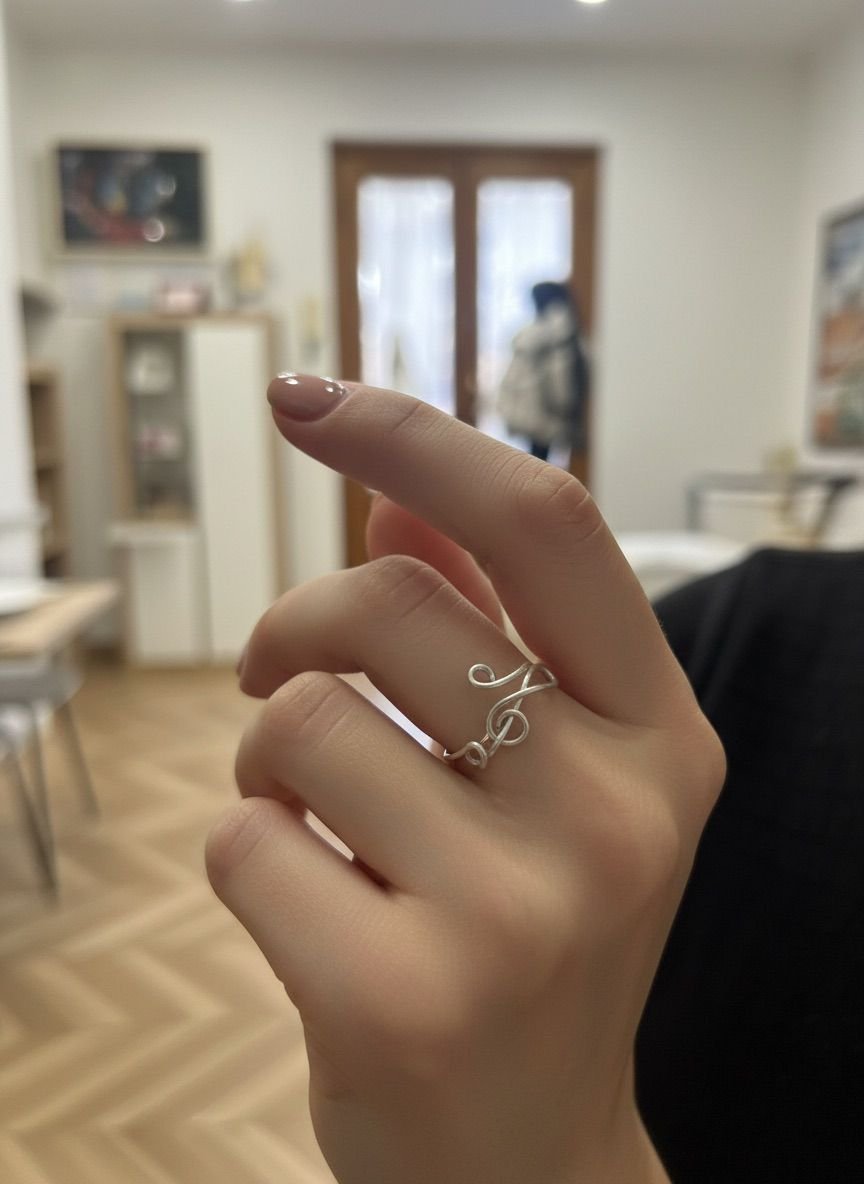 Anello artigianale in filo d’alluminio a forma di chiave di violino.