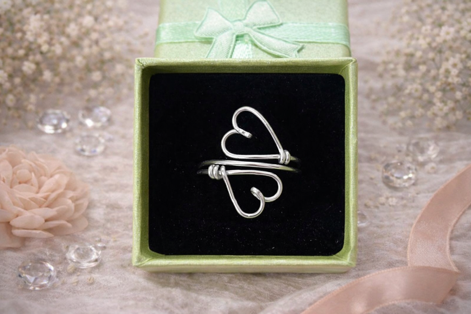 I cuori si fronteggiano senza toccarsi, raccontando un legame fatto di vicinanza, rispetto e connessione profonda. Le linee morbide e leggere seguono il gesto artigianale, rendendo ogni anello unico e leggermente diverso dagli altri.