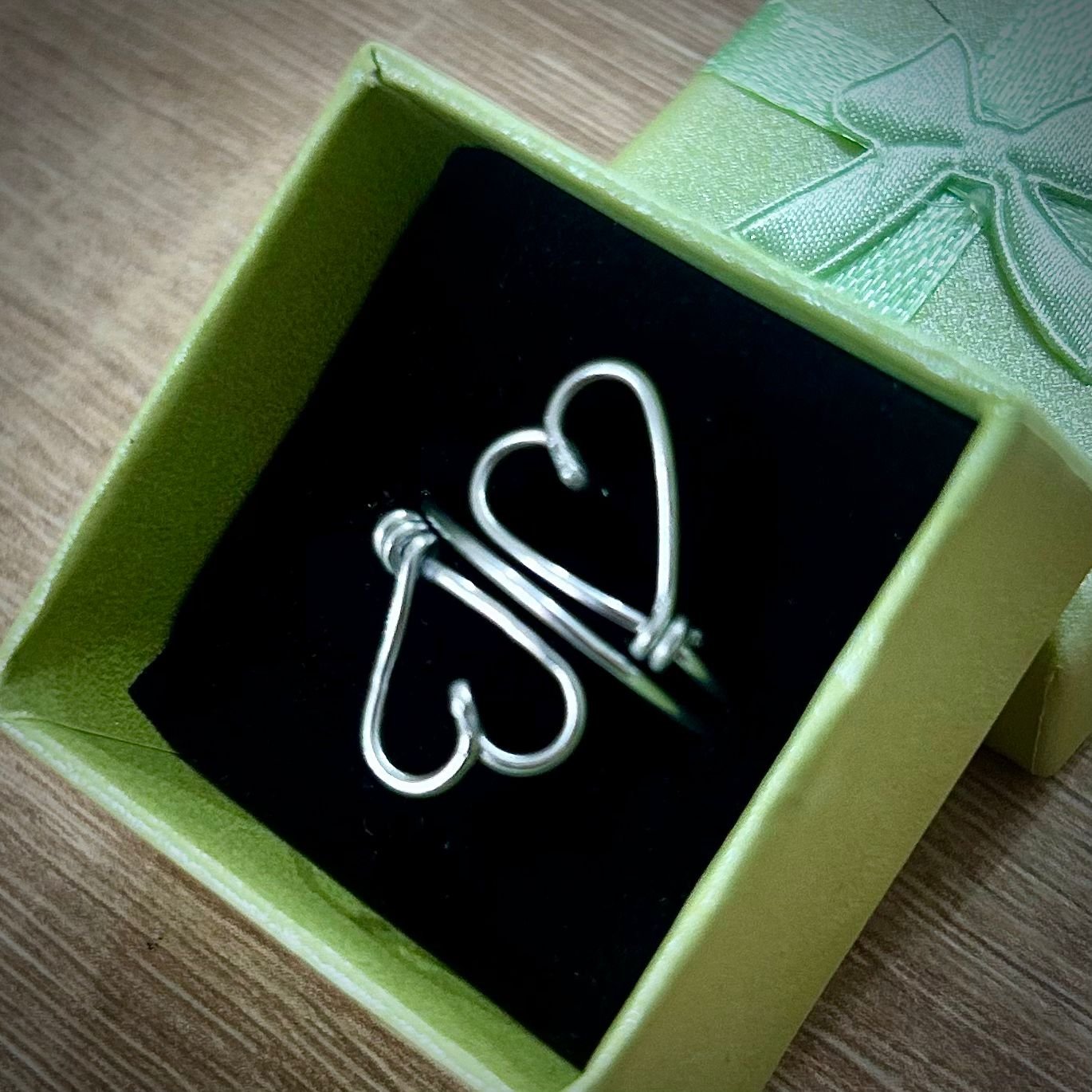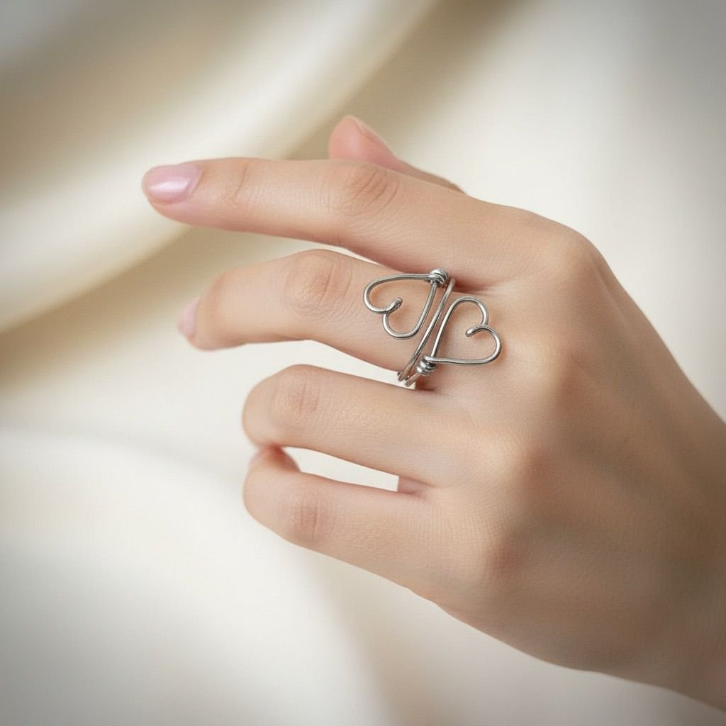 Cuori Gemelli è un anello delicato e simbolico, realizzato a mano modellando un unico filo di alluminio colorato fino a creare due cuori speculari, legati da un equilibrio sottile e armonioso.